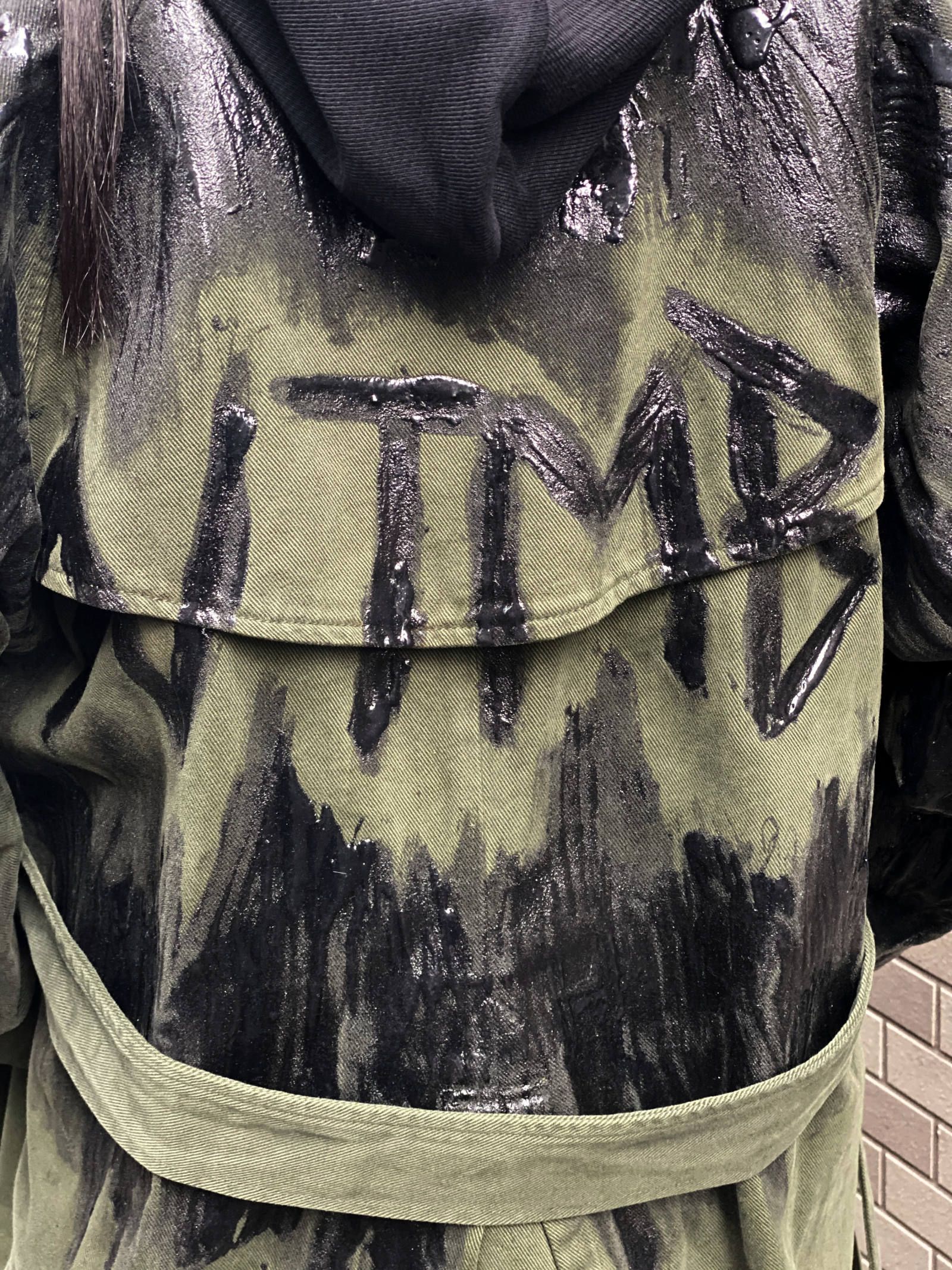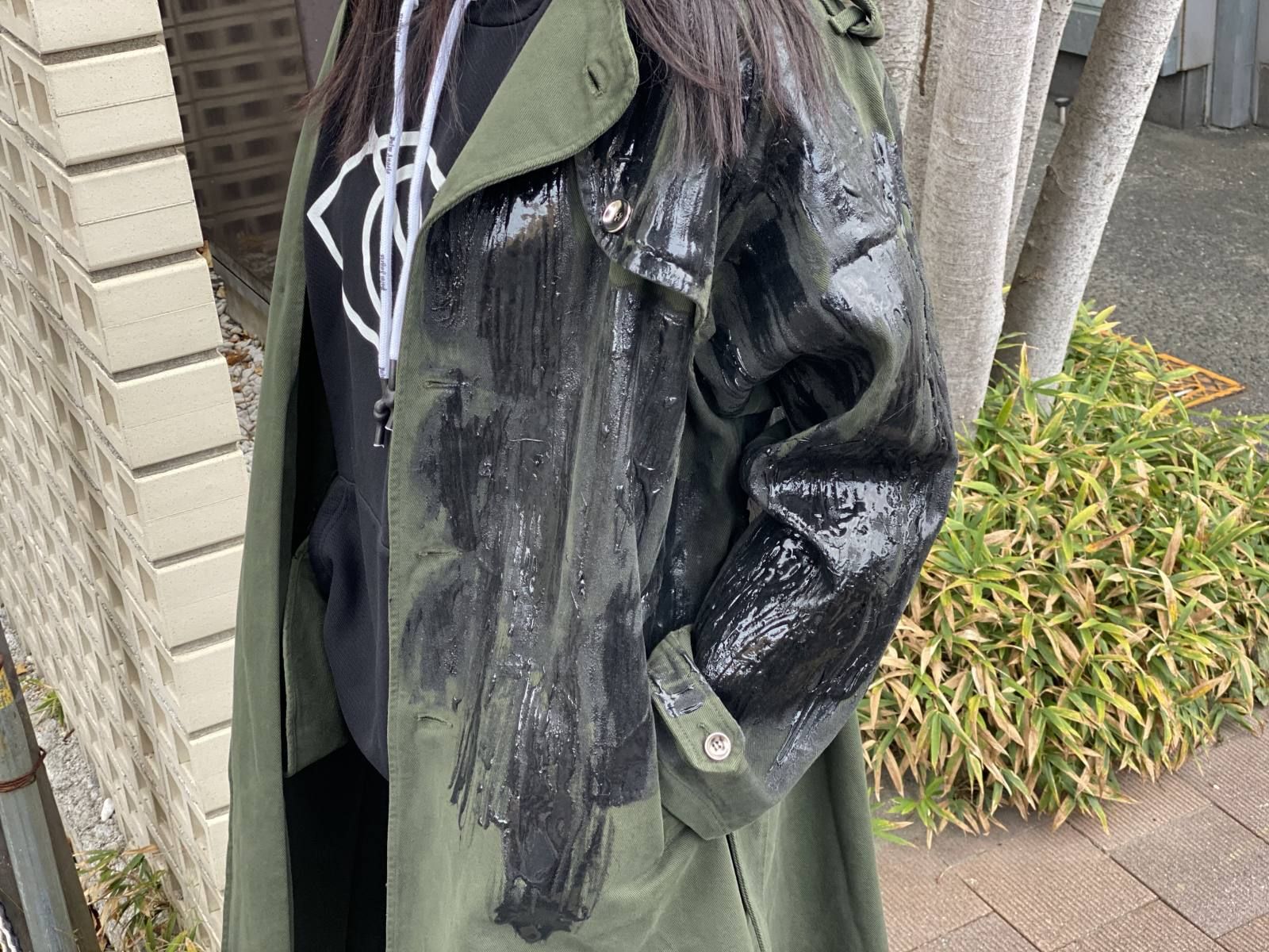 樹脂コーティングが施されたモードなオーバートレンチコート