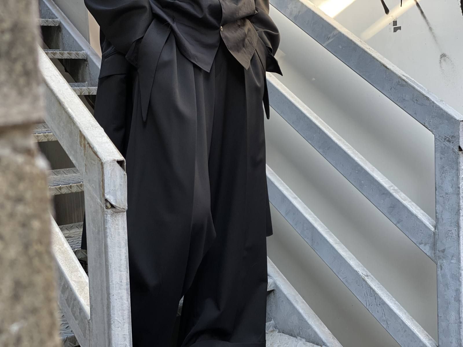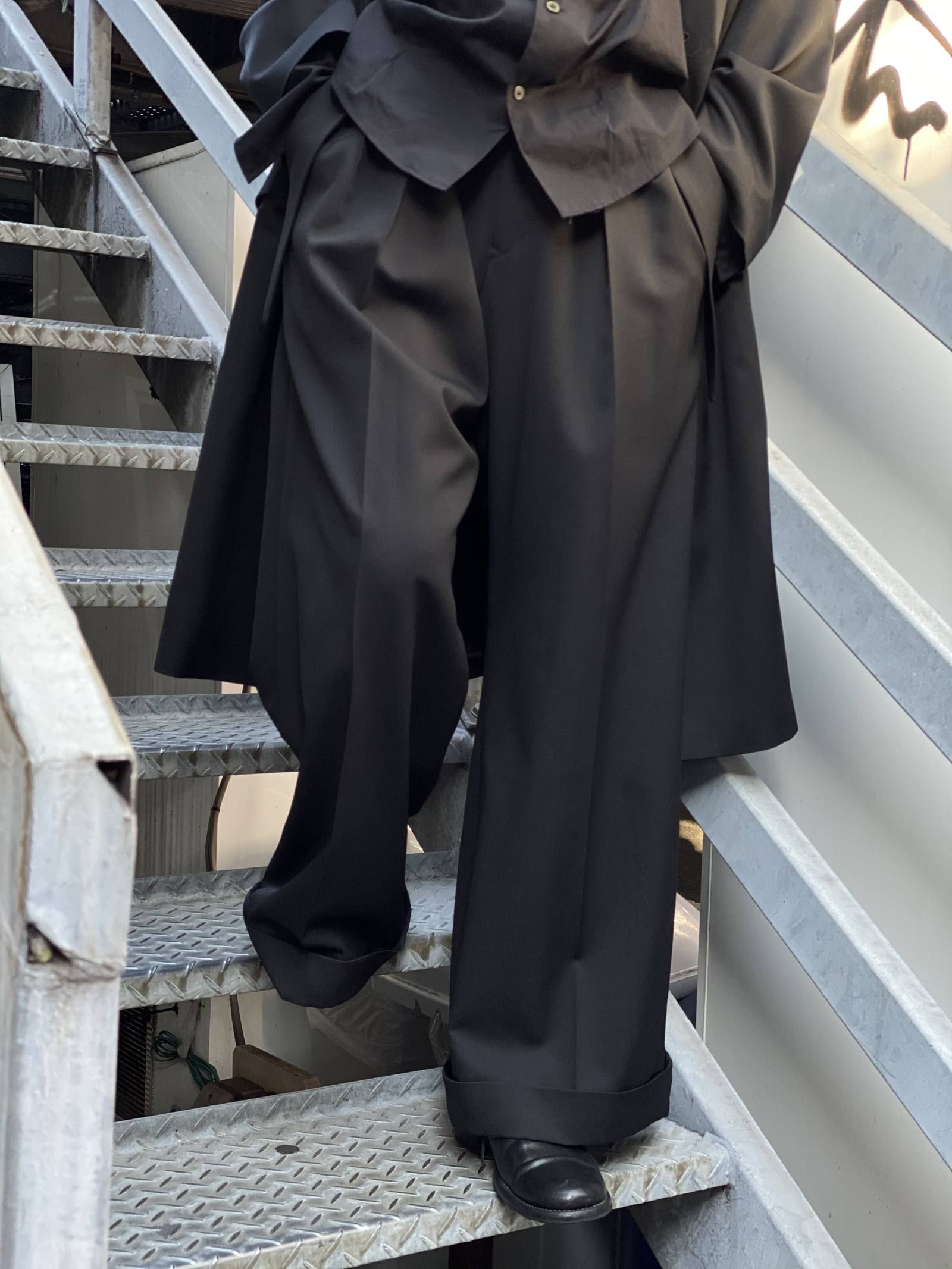 オリジナルのウールギャバを使用したドレープや光沢感が特徴のアイテムで裏地には全面キュプラを貼っています。