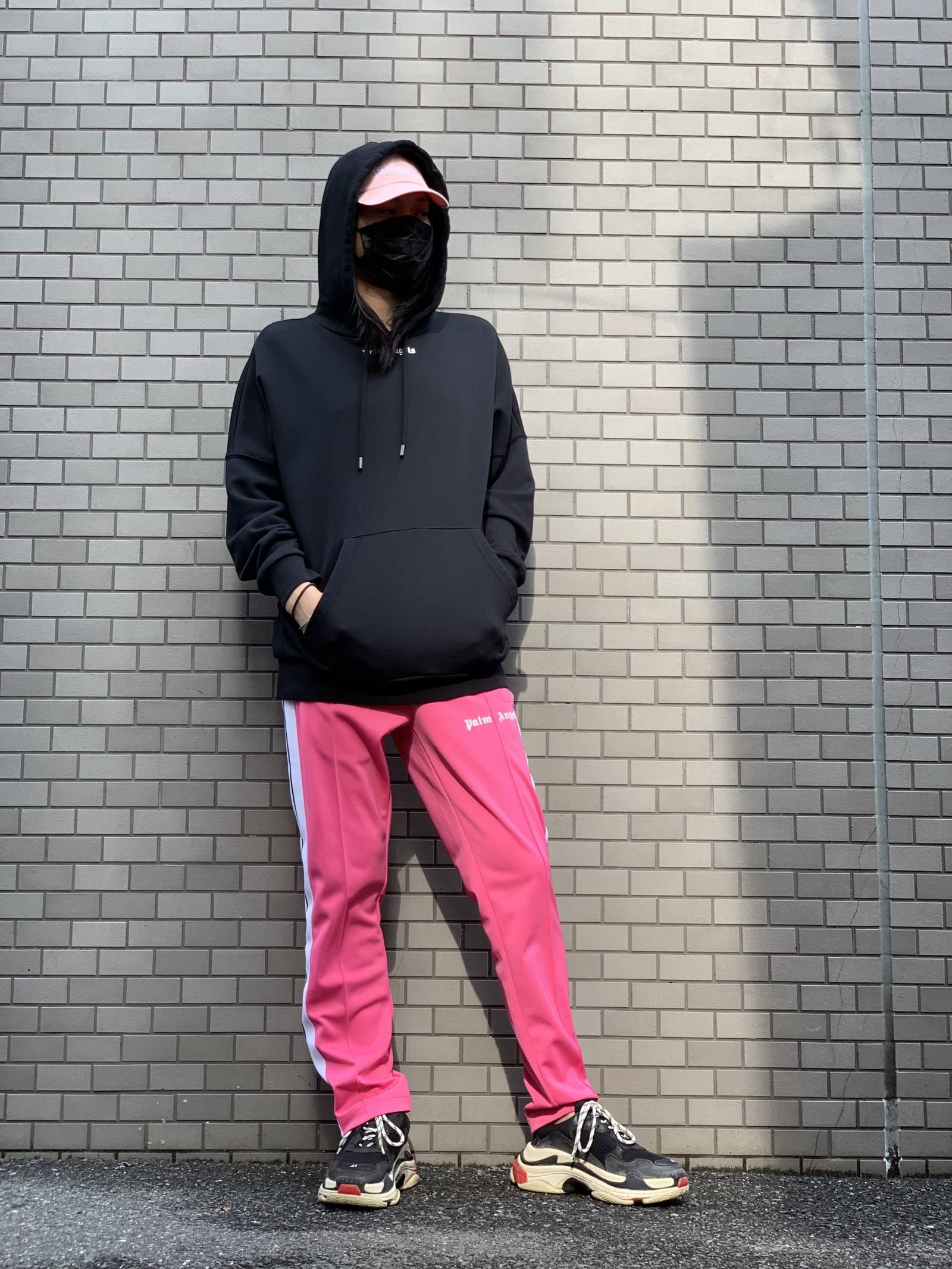 今回は同ブランドのサイドライントラックパンツと合わせていますが、夏らしくショートパンツに合わせるコーデもオススメです!