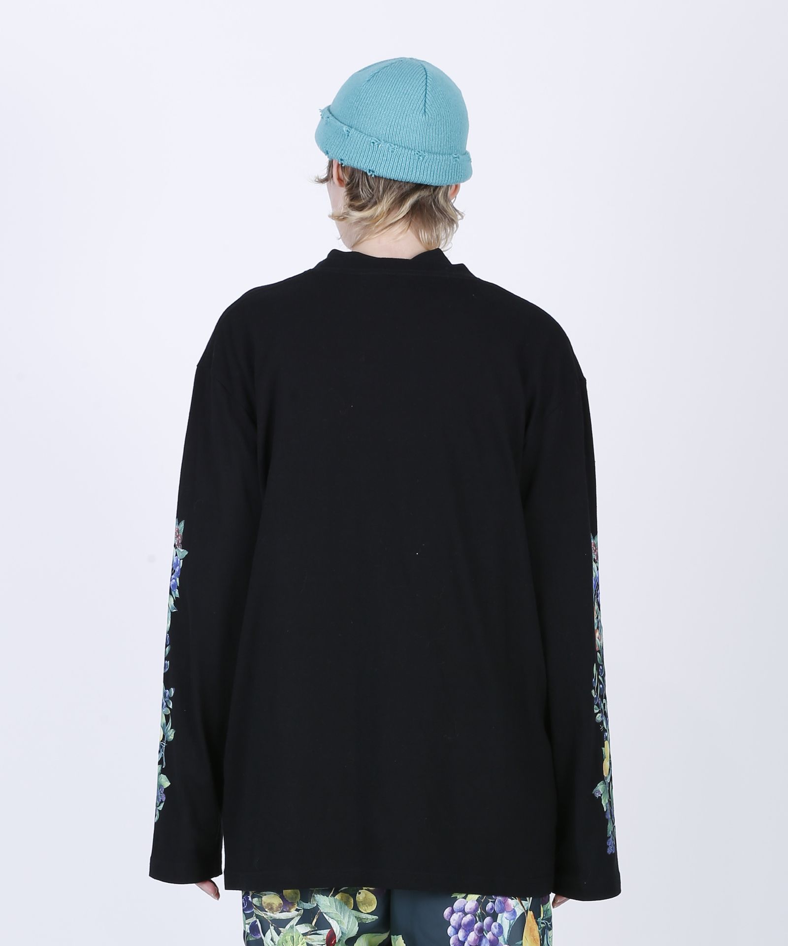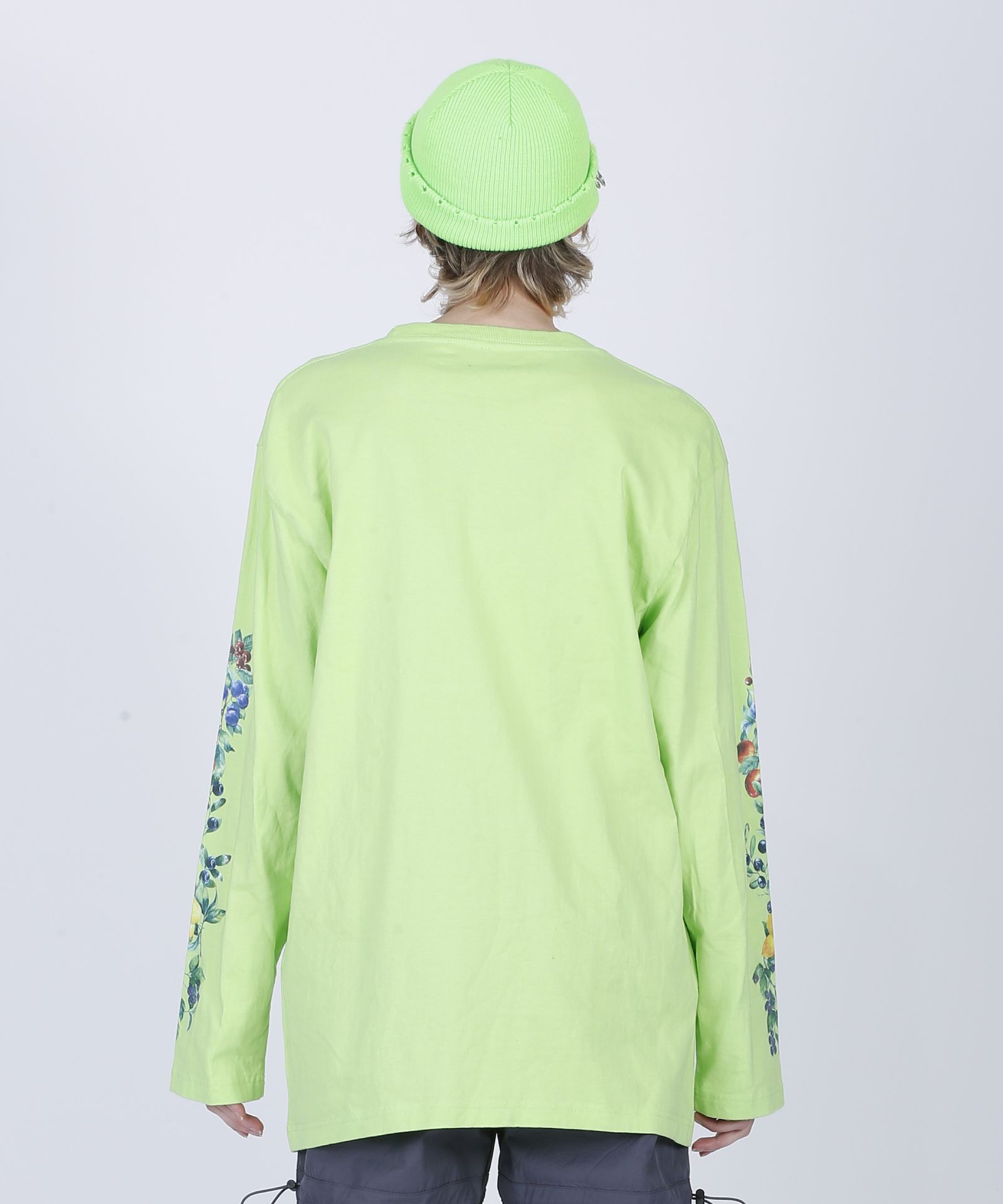 袖にプリントされた水彩画のフルーツプリントと、発色のいいカラーリングが特徴です。