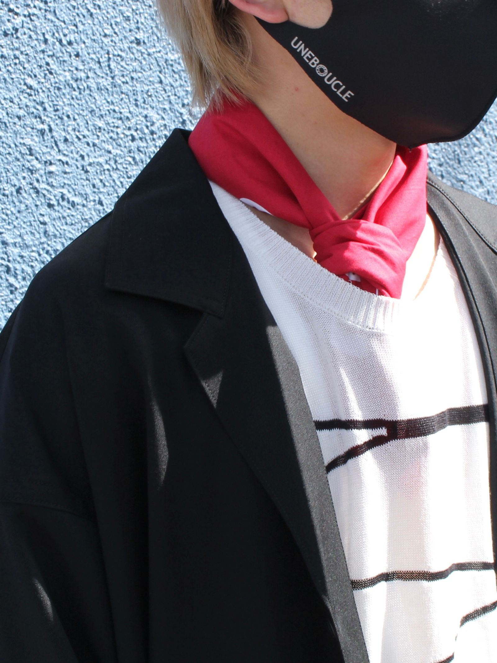 全体のスタイリングがややモノトーン調になっている為、差し色として同ブランドの赤色バンダナを取り入れカジュアル色も演出。