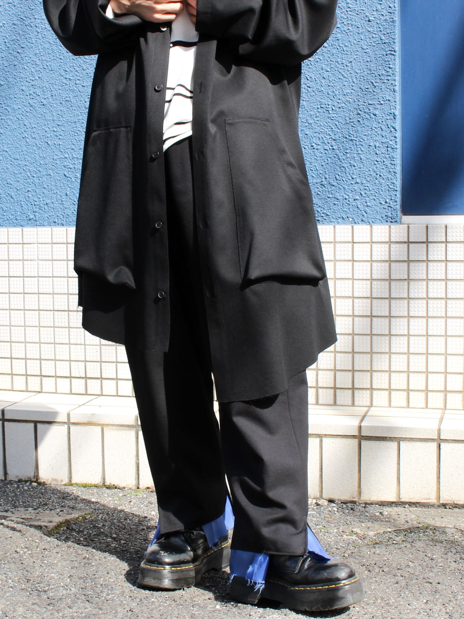 スリットテーパードパンツはセットアップ展開としてリリースされているアイテムですが、今回のようにアシンメトリーシャツなどとスタイリングしてもしっかりカッコいいスタイリングが可能です◎