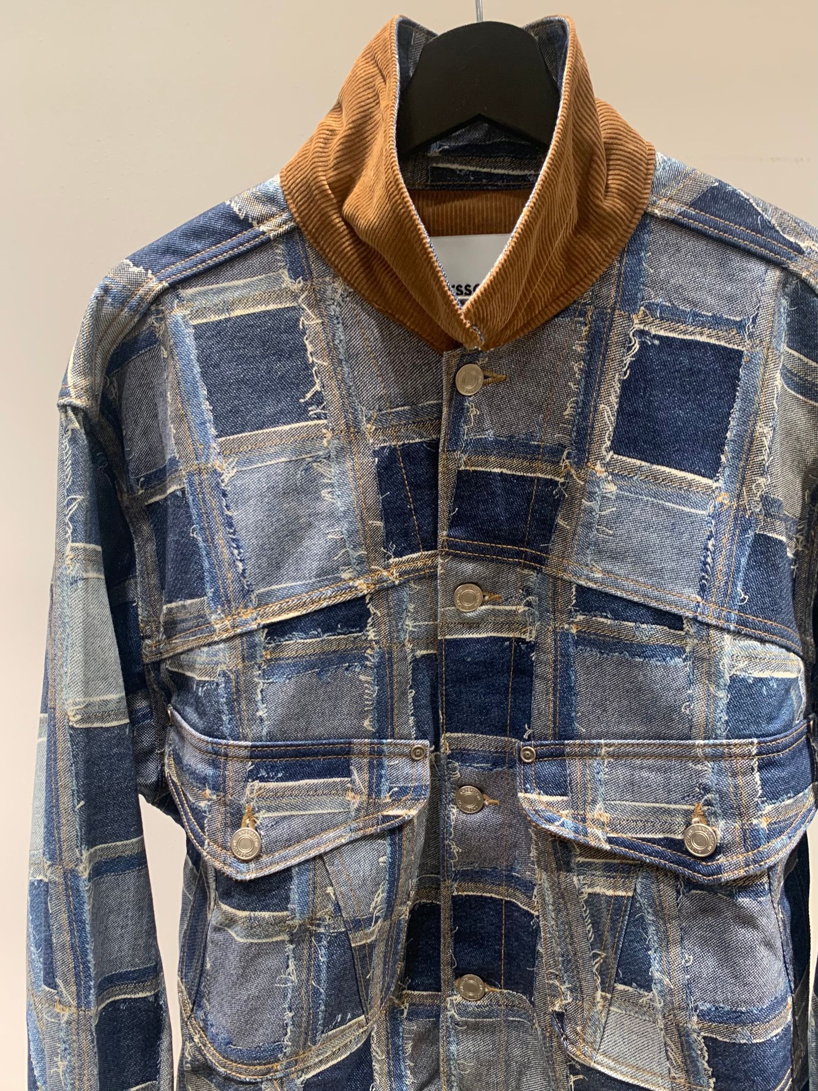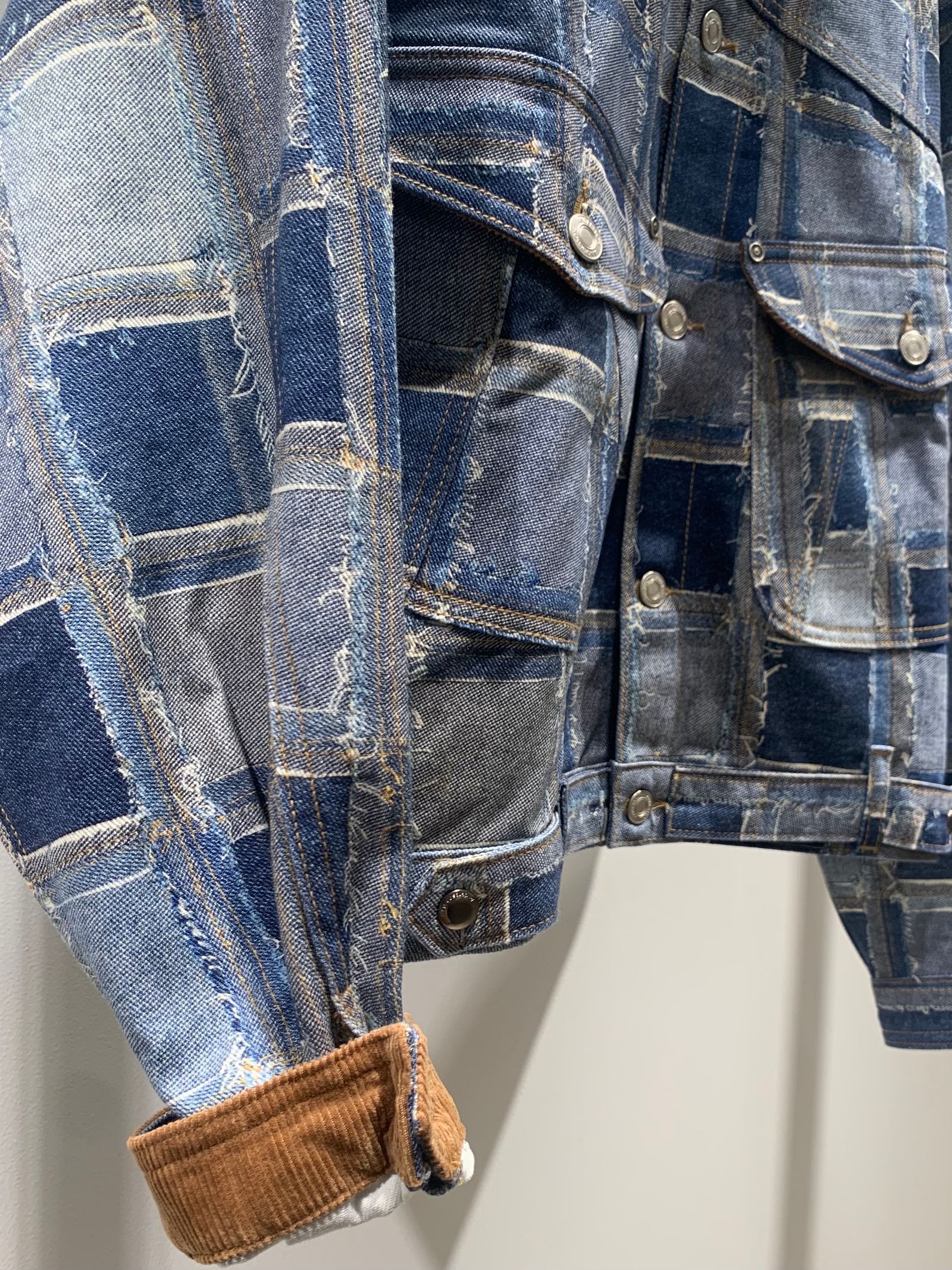 再構築デザインのようなプリントが施されたプリントデニムジャケット。