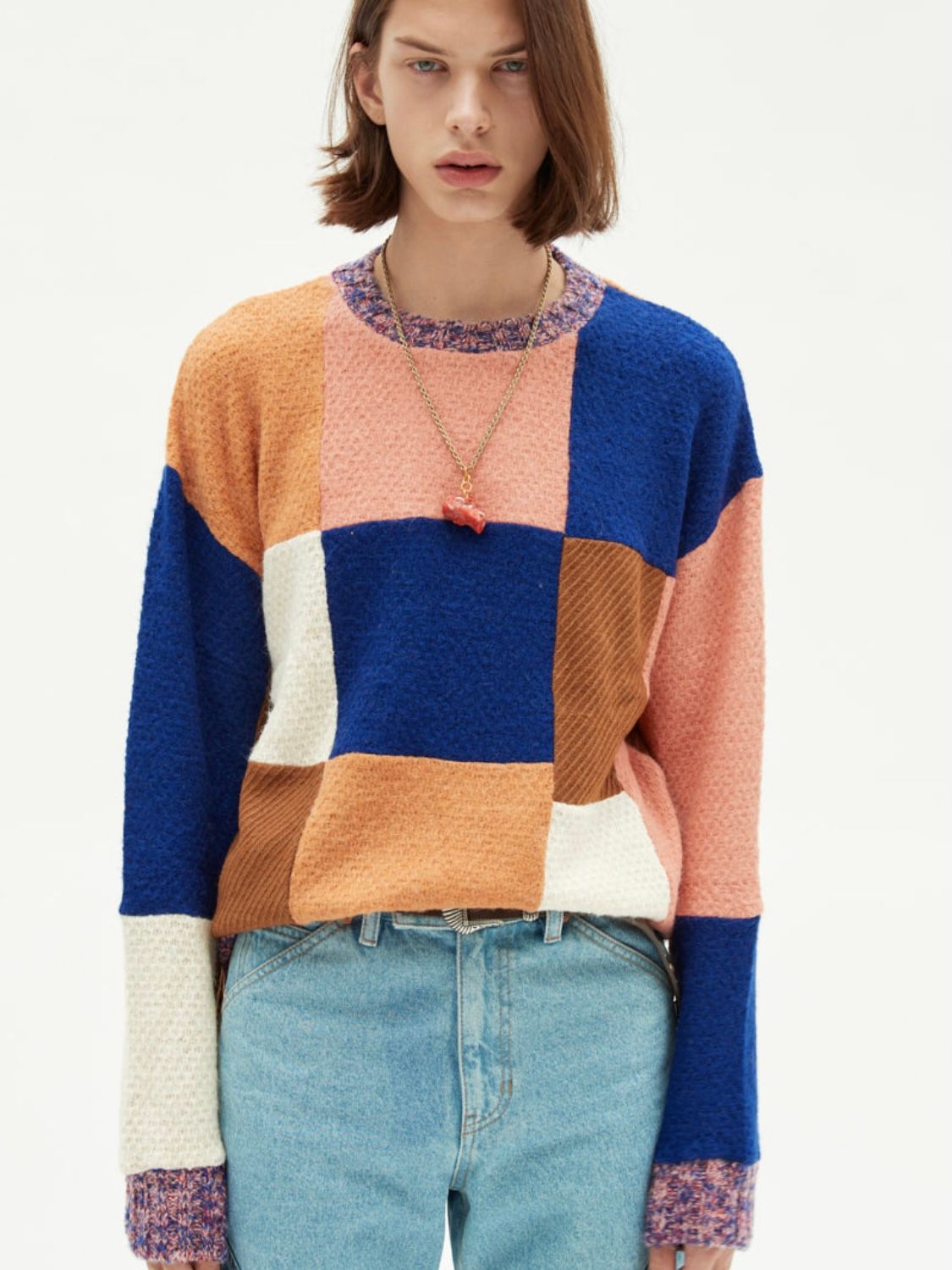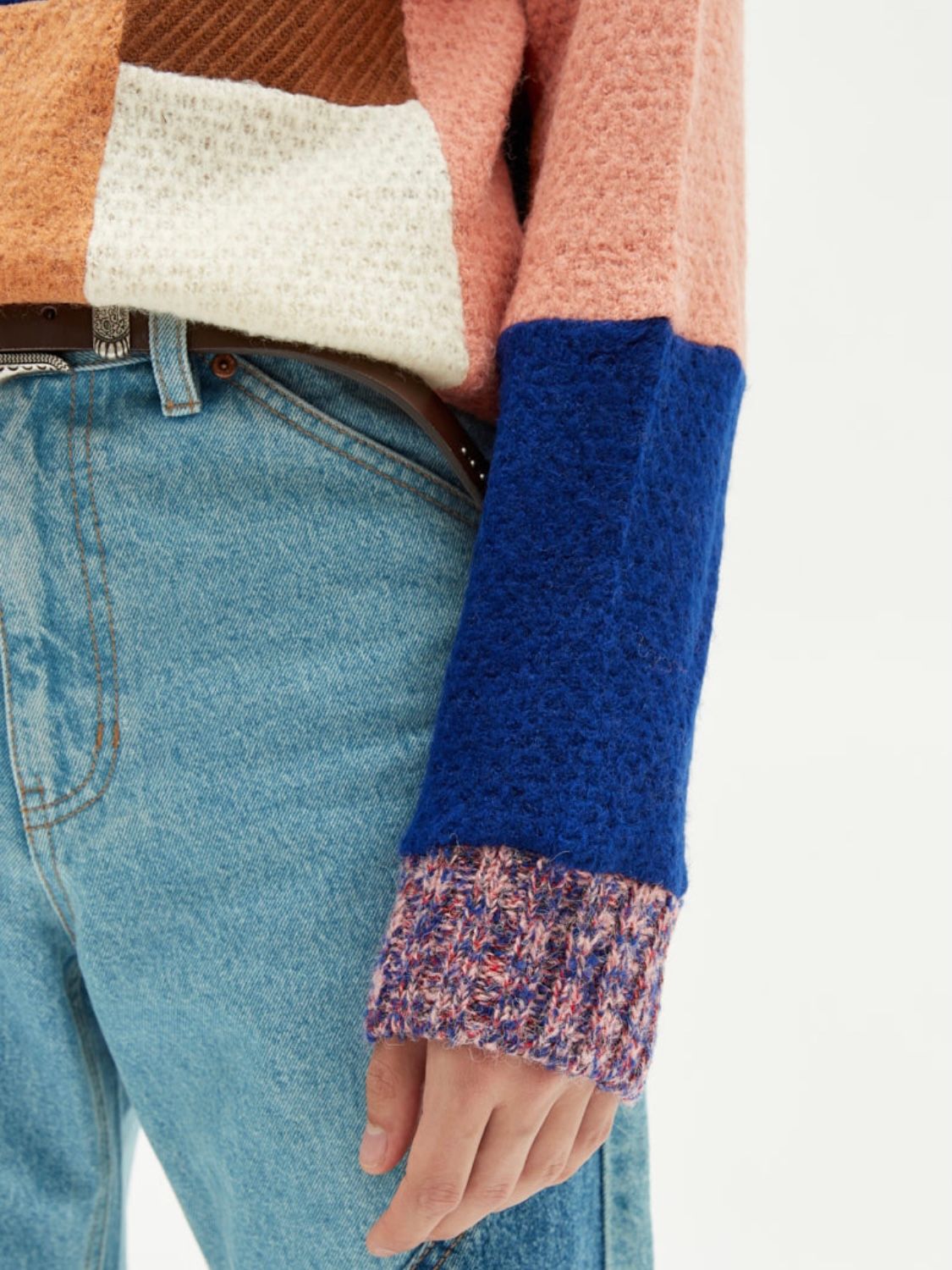 明るく華やかなピンク、ブラウン、ブルーの三色を採用したブロックカラーニット。