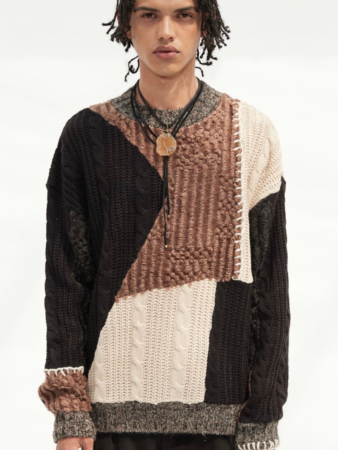 よく見ると四種類ものニットを再構築しており、ニットアイテムの中でもかなりデザインの効いたアイテムとなっております。