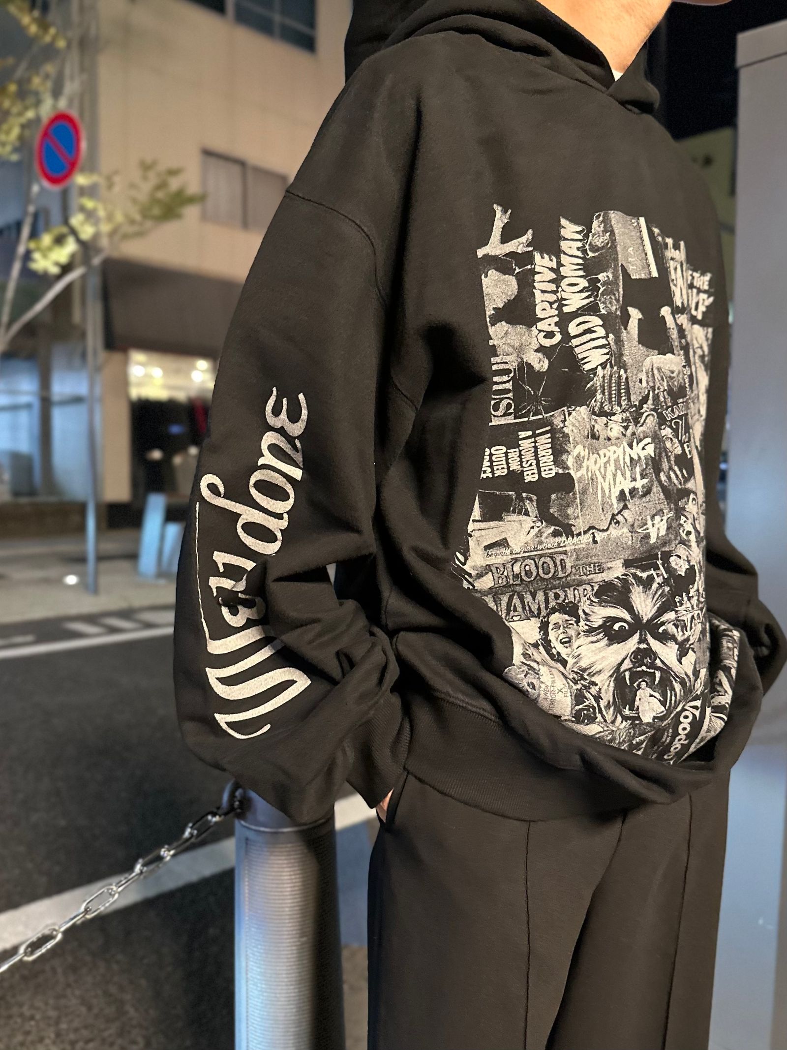 フロントには WE11DONE 大人気グラフィックデザインの "ホラーコラージュ"のプリントをバックには定番デザインでもある、ネームシリコンタグをあしらった一点。
