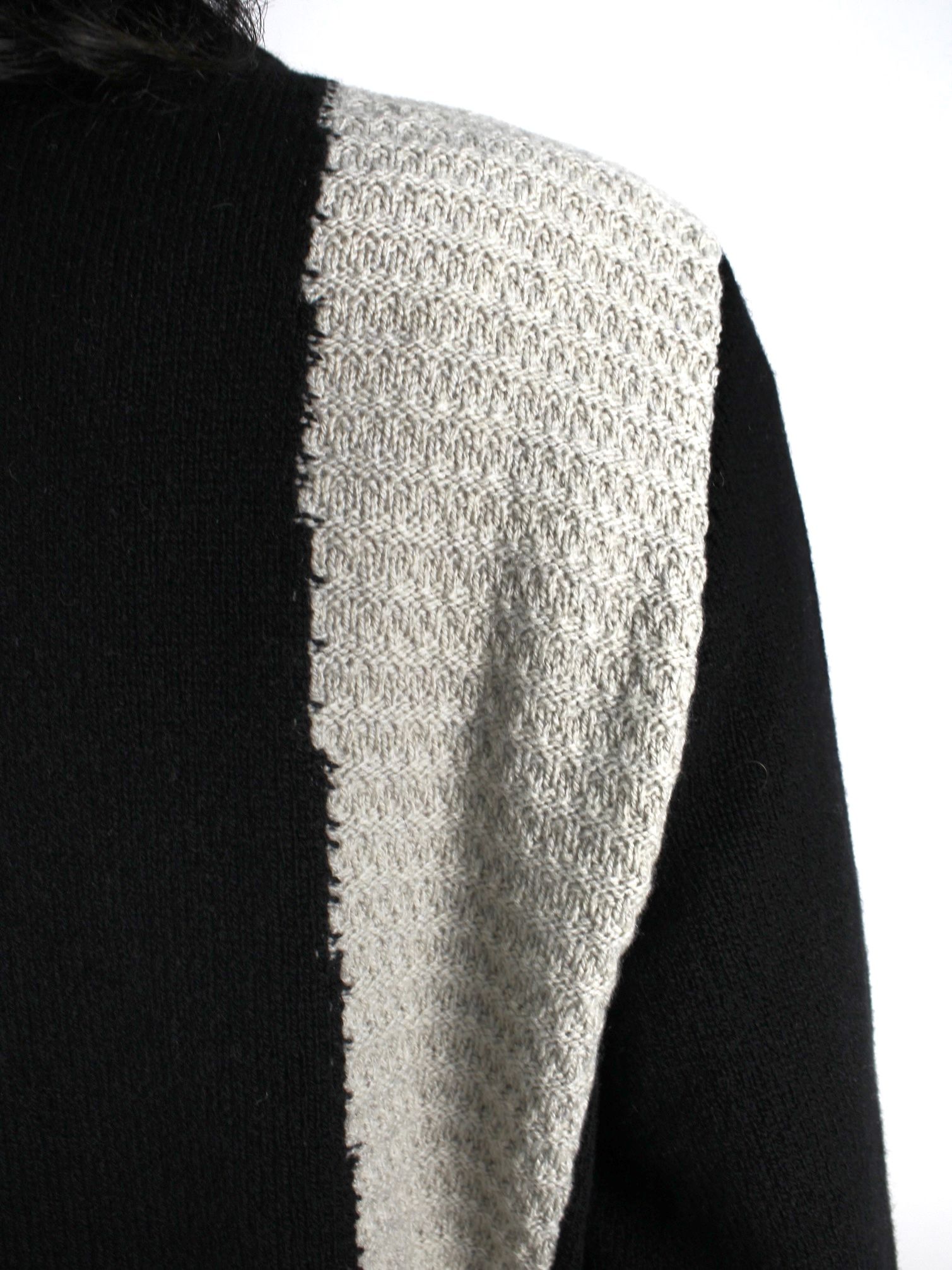 カラーによる切り替えだけでなく黒の生地部はハイゲージ、白の生地部はローゲージと編み方を変えることでメリハリのある印象的なデザインに。