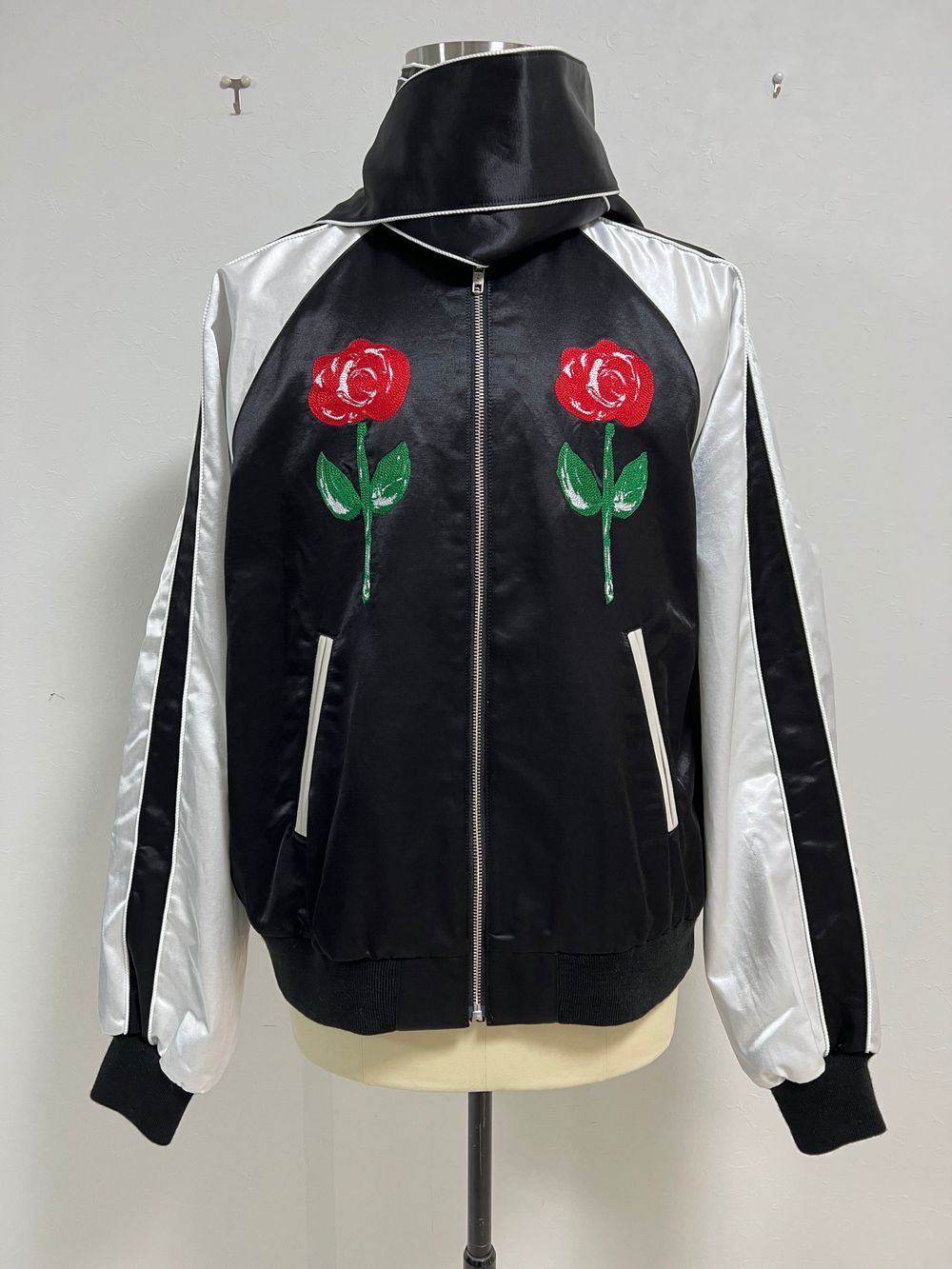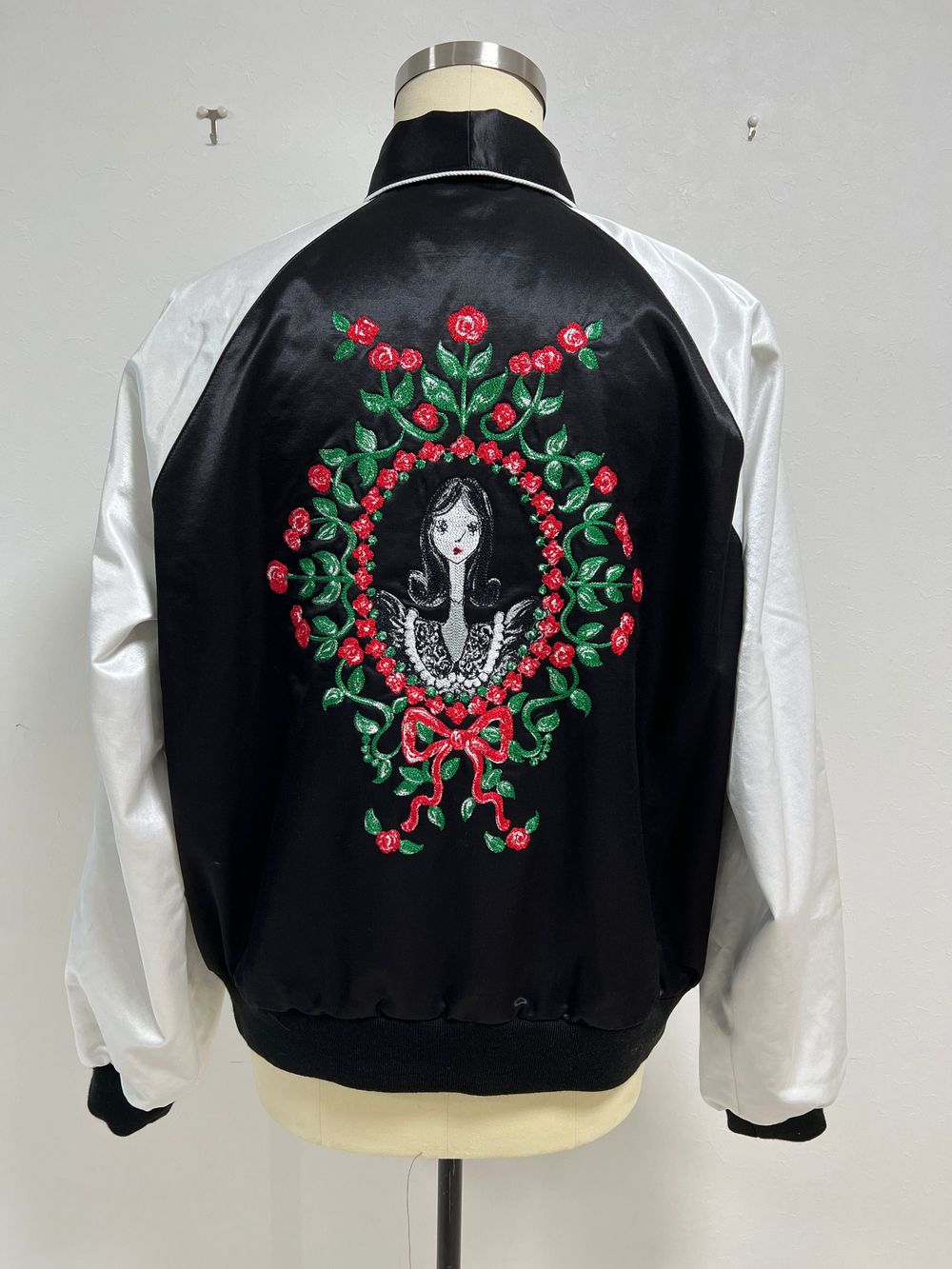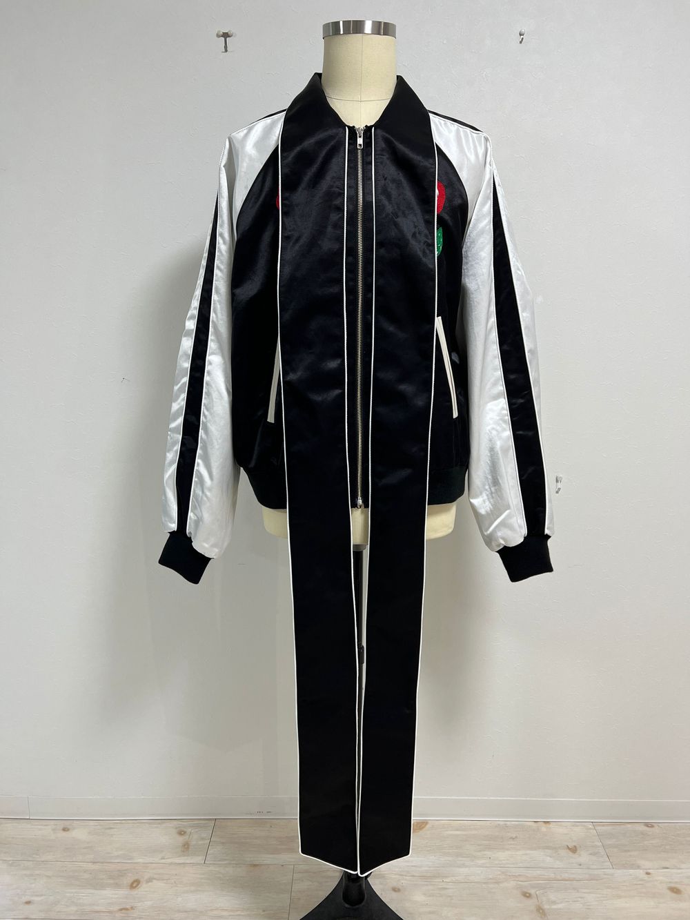 最後にご紹介させていただくのは、取り外し可能なボウタイ部分と取り外し印象的なバック刺繡が魅力のスカジャンになります。
