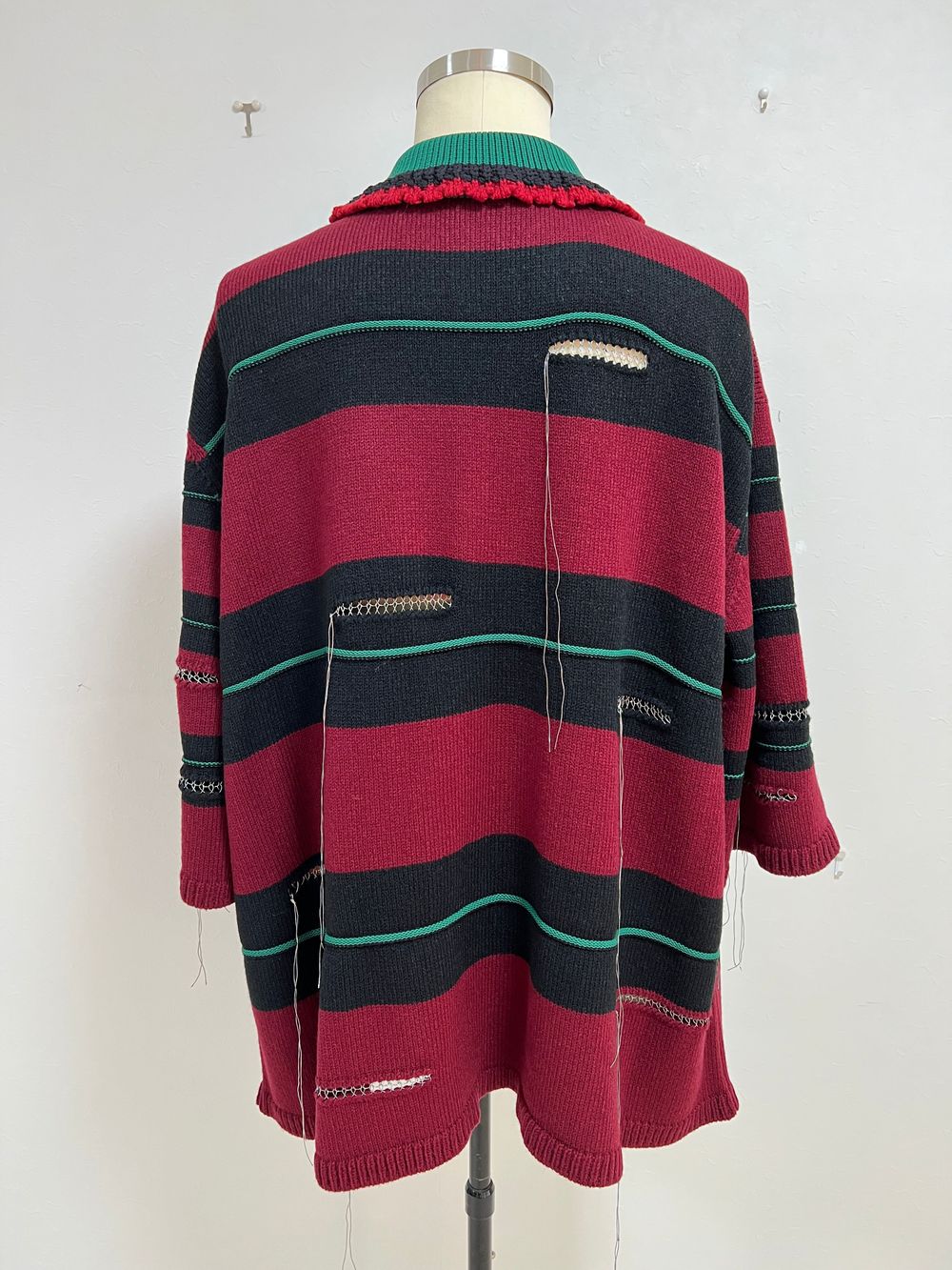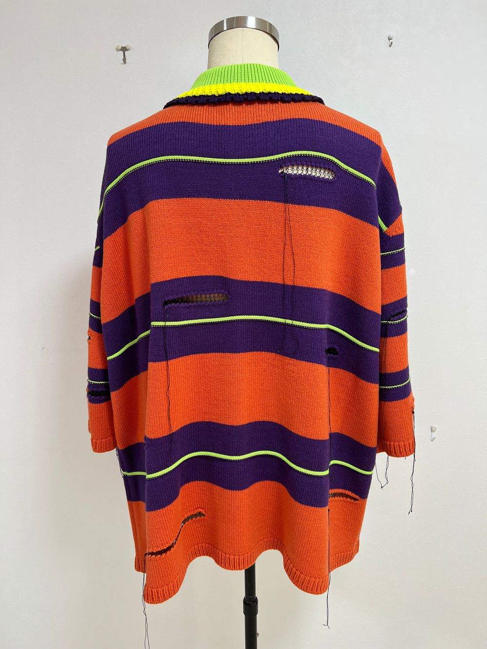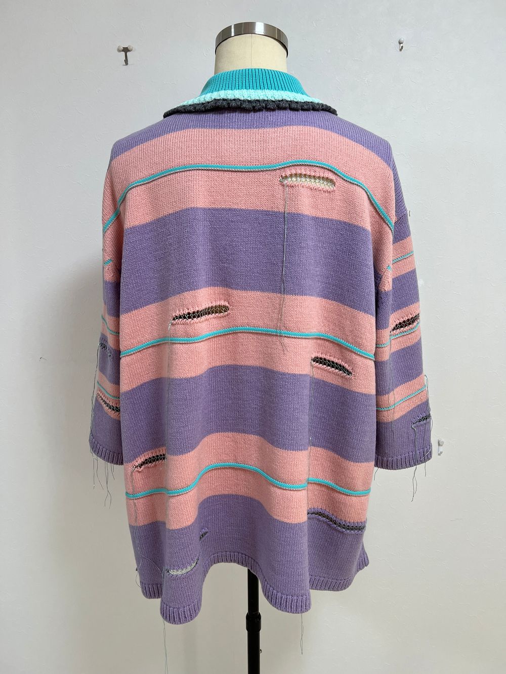今作は、ボディの数カ所にカットを入れ、間をラメ糸で継ぎ接ぎしたようなデザインのボーダーニットポロ。