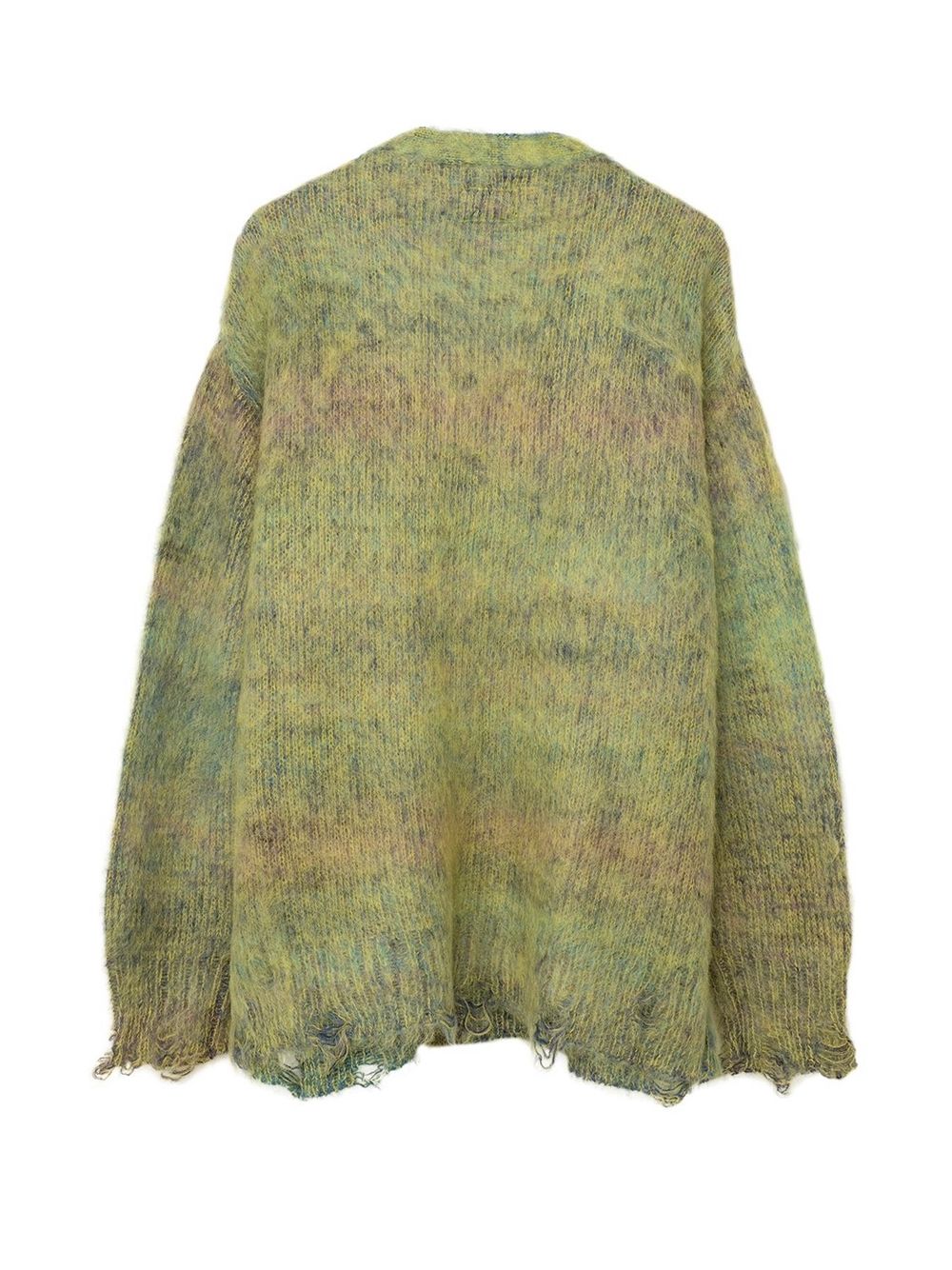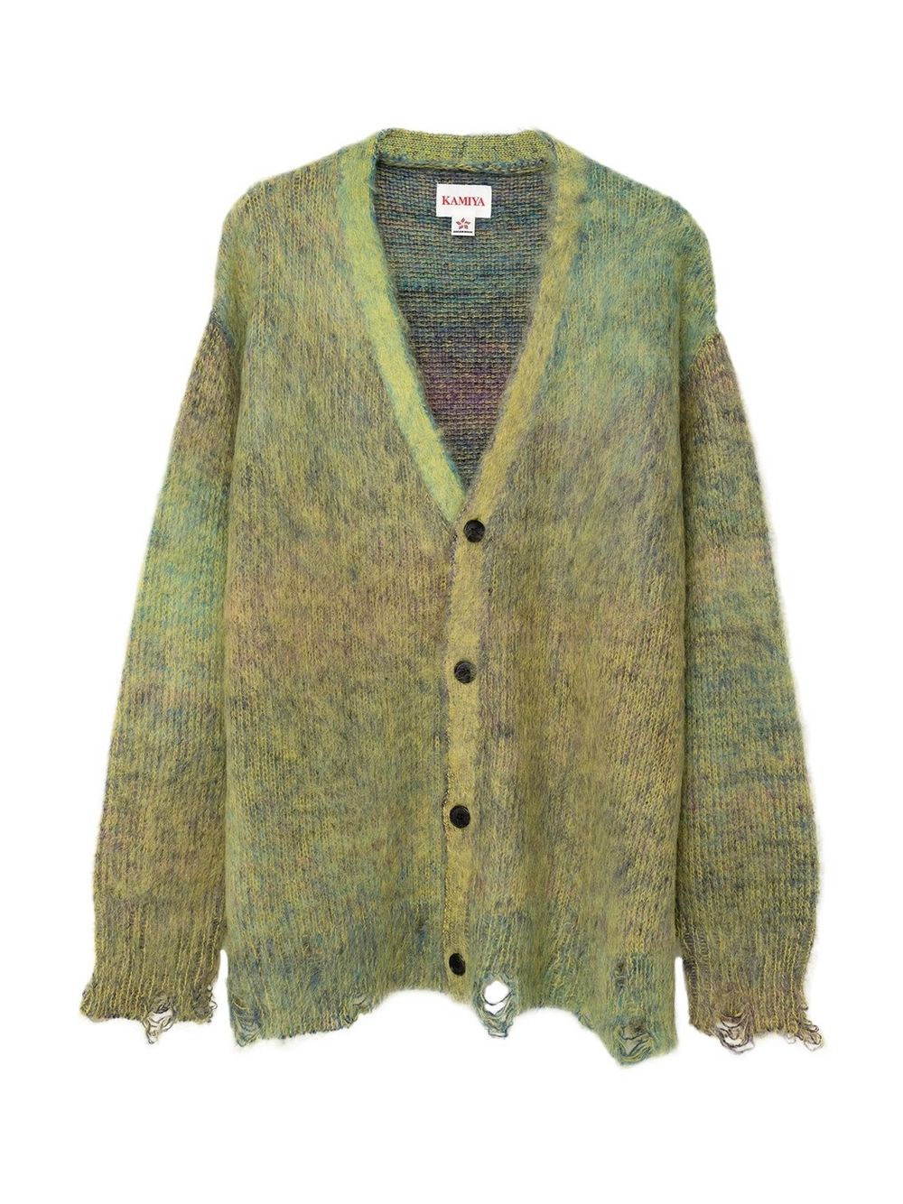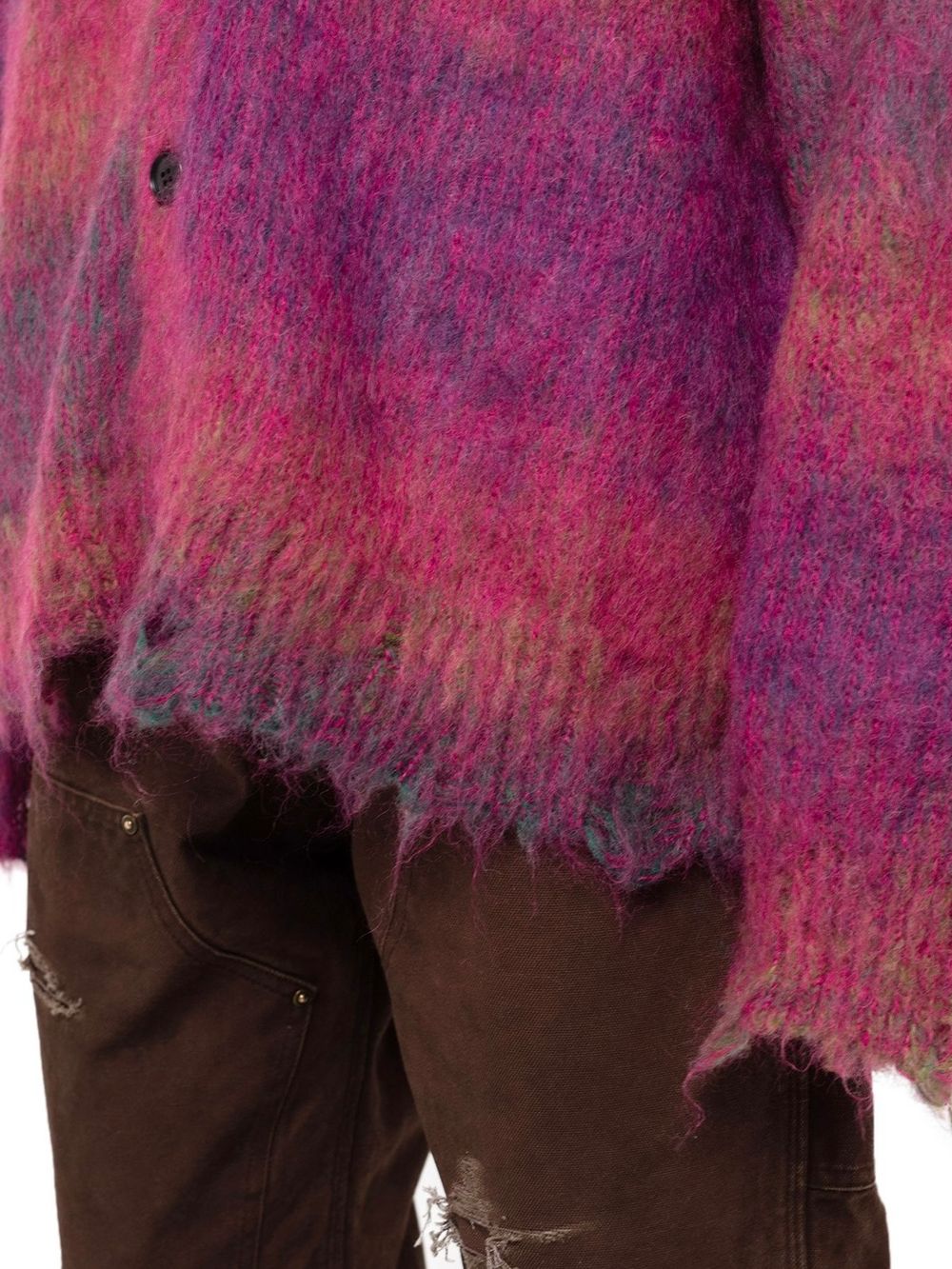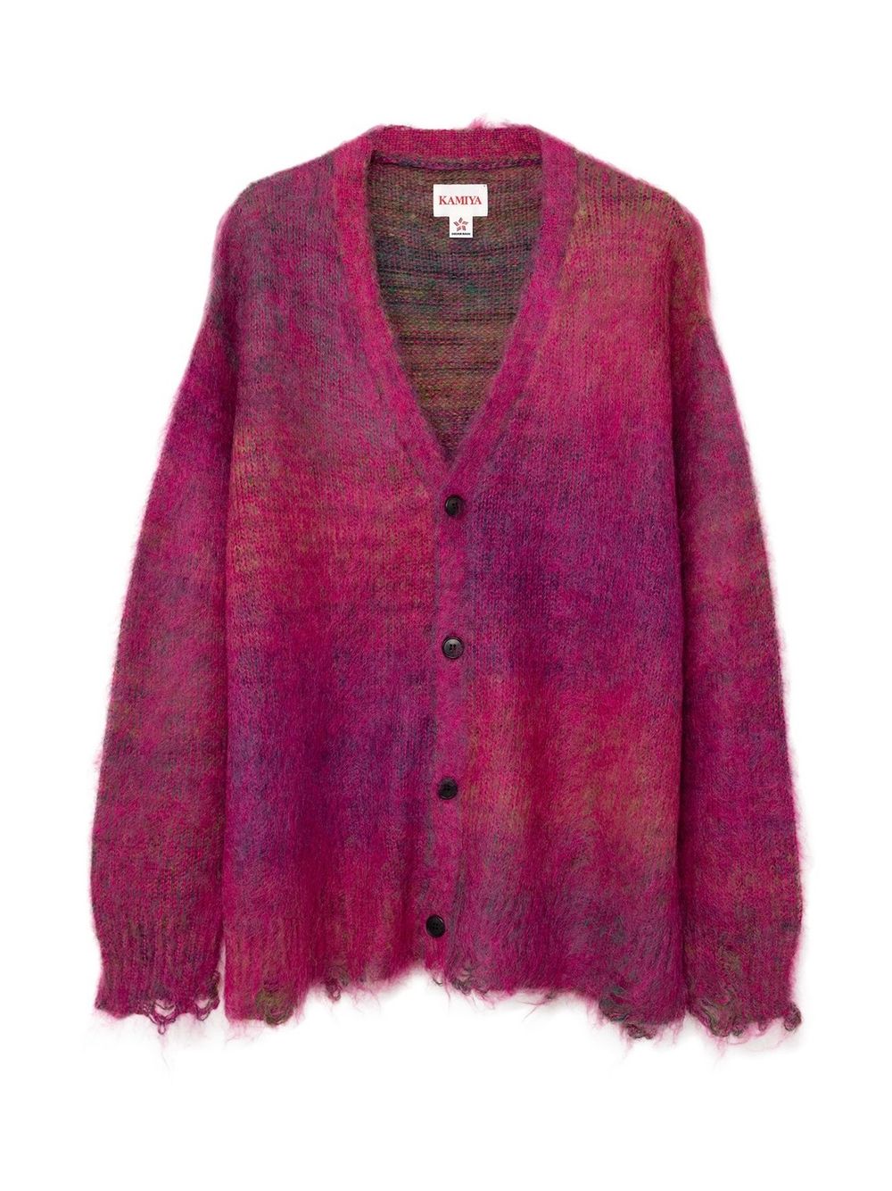 初めにご紹介させていただくのは、モヘア糸とウール糸を擦り染色し、プレーティングすることで、グラデーションを出したニットカーディガン。