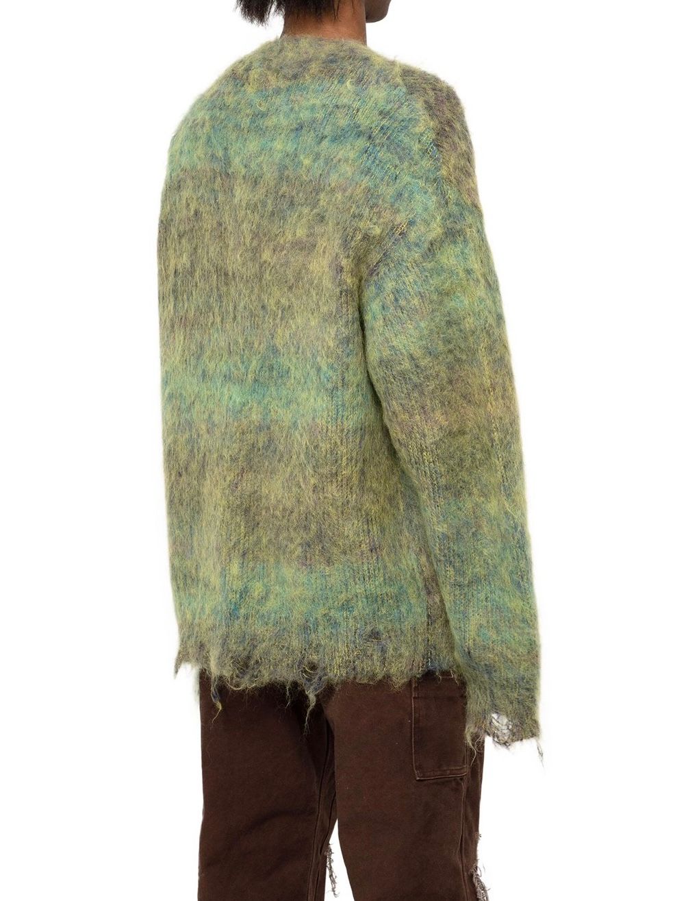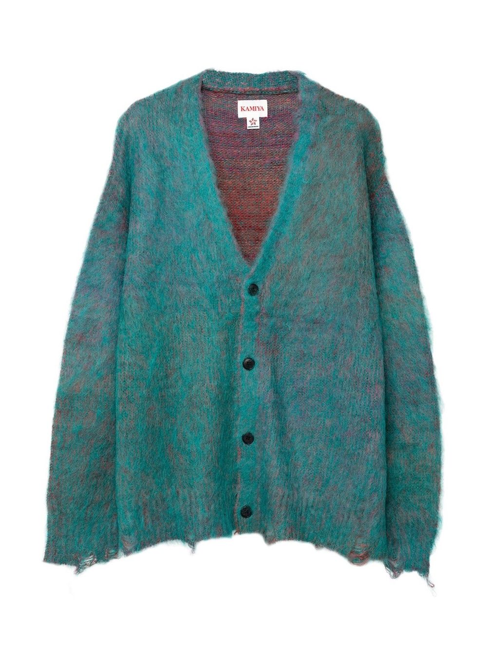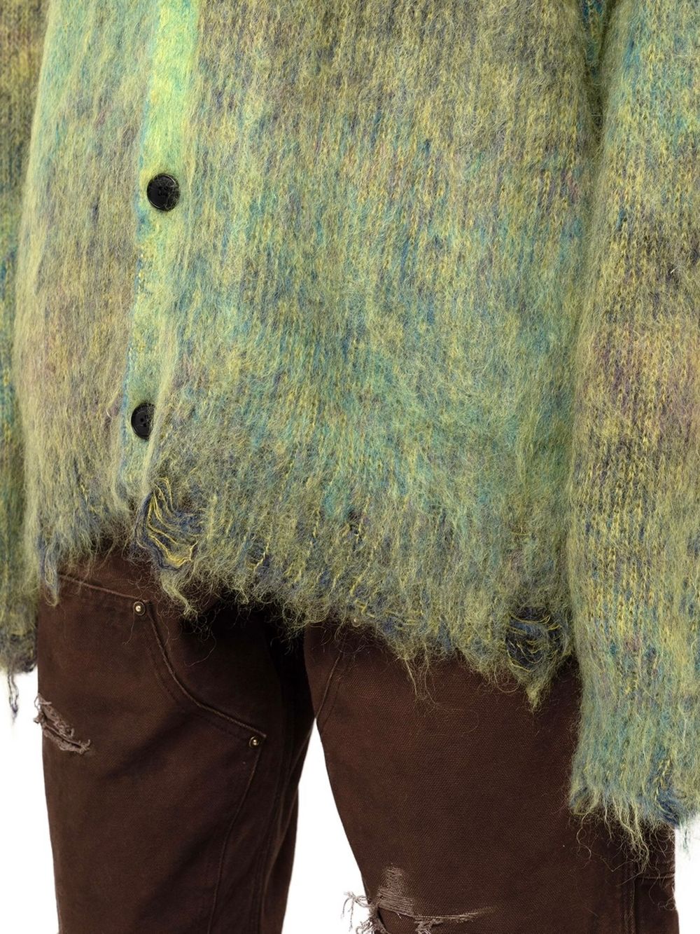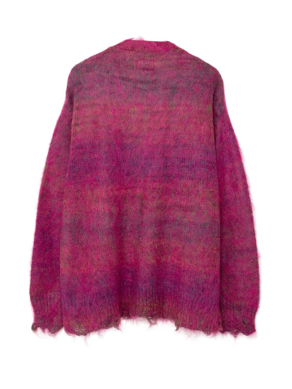 初めにご紹介させていただくのは、モヘア糸とウール糸を擦り染色し、プレーティングすることで、グラデーションを出したニットカーディガン。