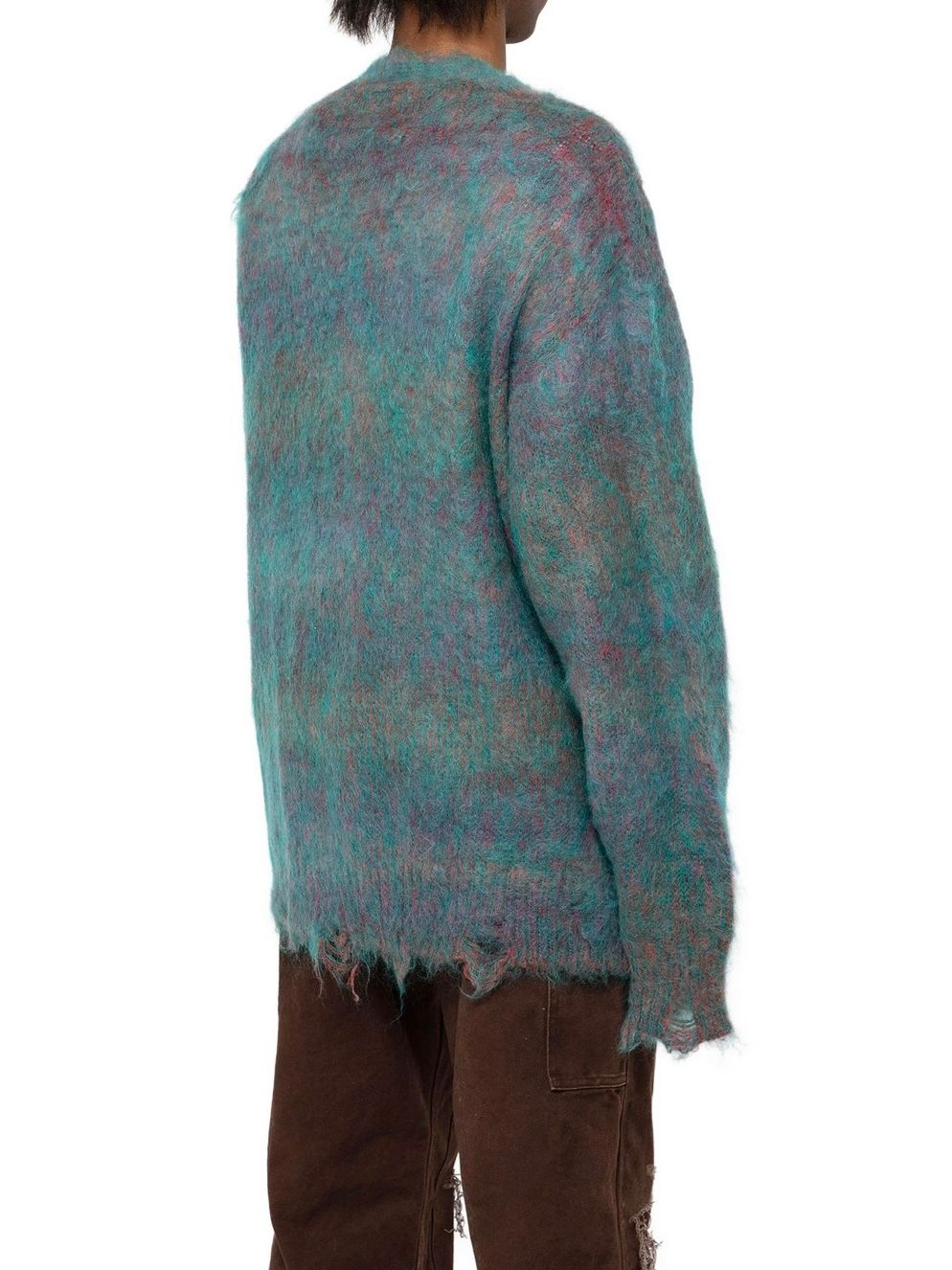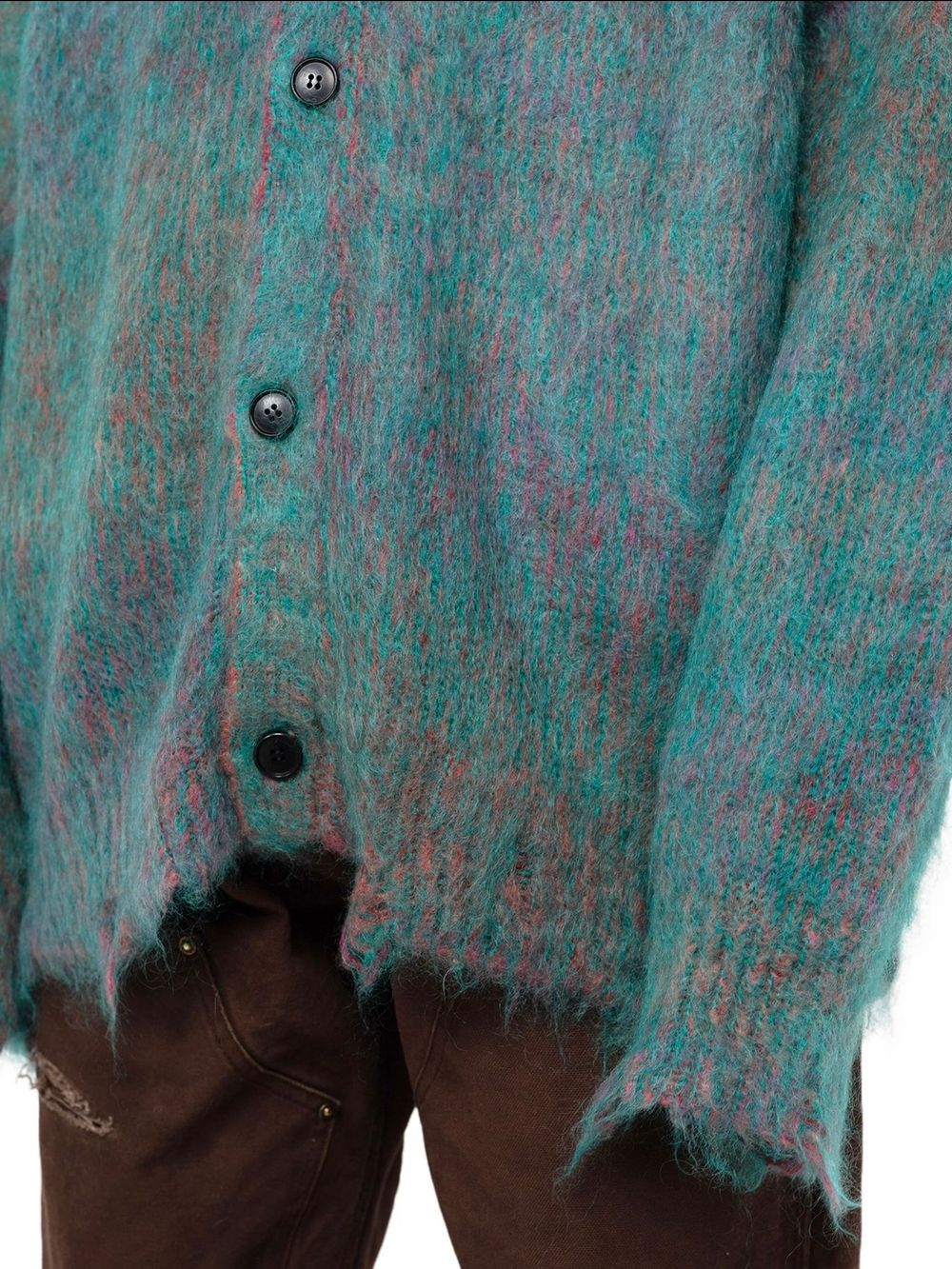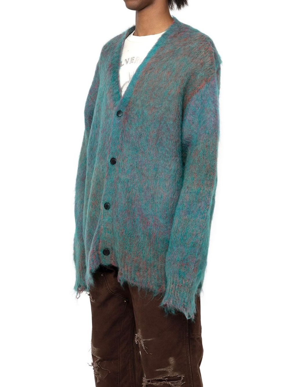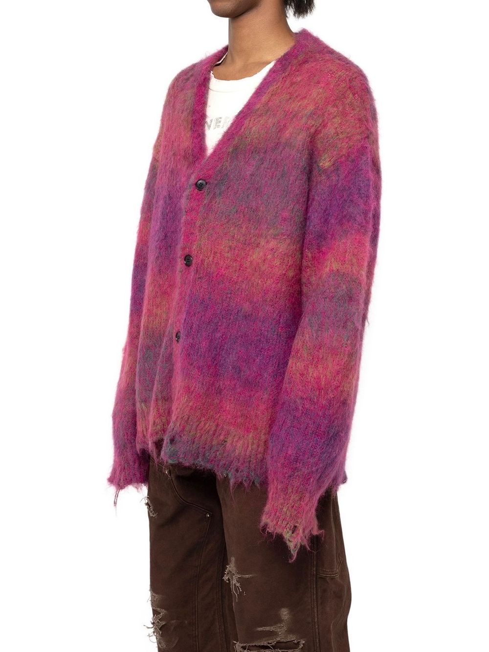 初めにご紹介させていただくのは、モヘア糸とウール糸を擦り染色し、プレーティングすることで、グラデーションを出したニットカーディガン。