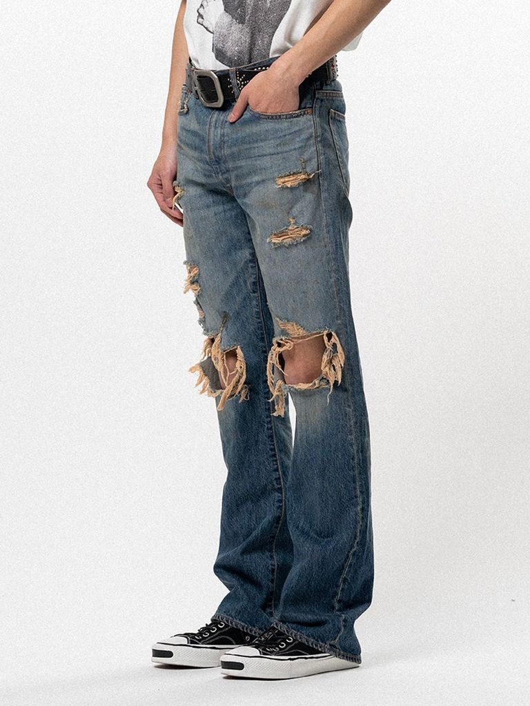 【BTS JIN 着用】ディストレスド スリム ブーツカット ダメージ加工 デストロイ ジーンズ / DSTRSD SLM BOOTCT JEANS / インディゴ